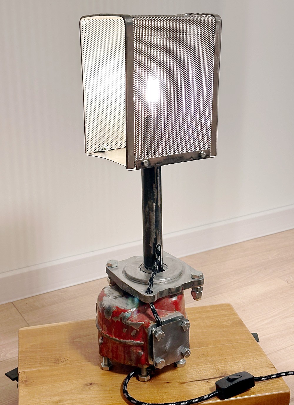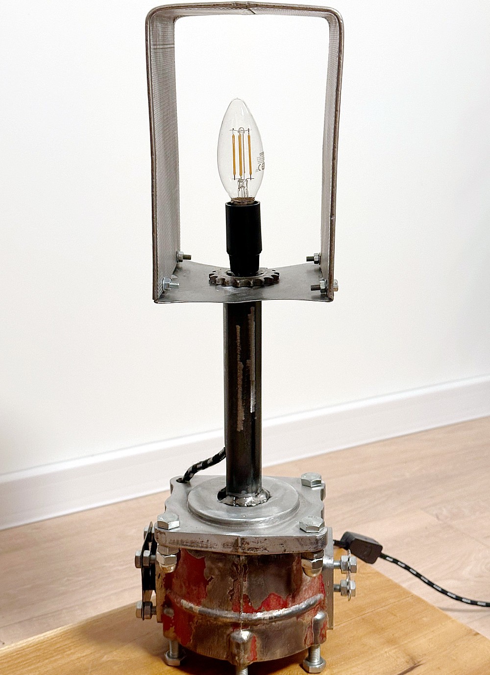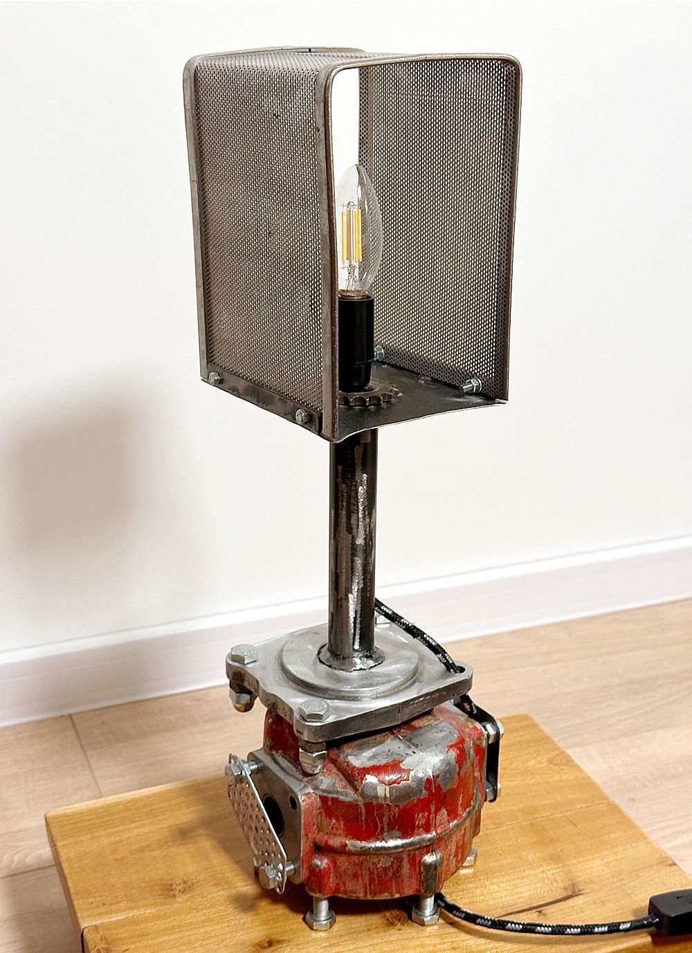 Veioza model industrial vintage, lucat manual din piese din metal vopsit cu lac transparent, are 7 kg greutate. Cablul de alimentare este cu material textill are 2,5 m lungime, partea de abajur este din inox, dimensiuni: inaltime: 52 cm, latime: 18 cm.